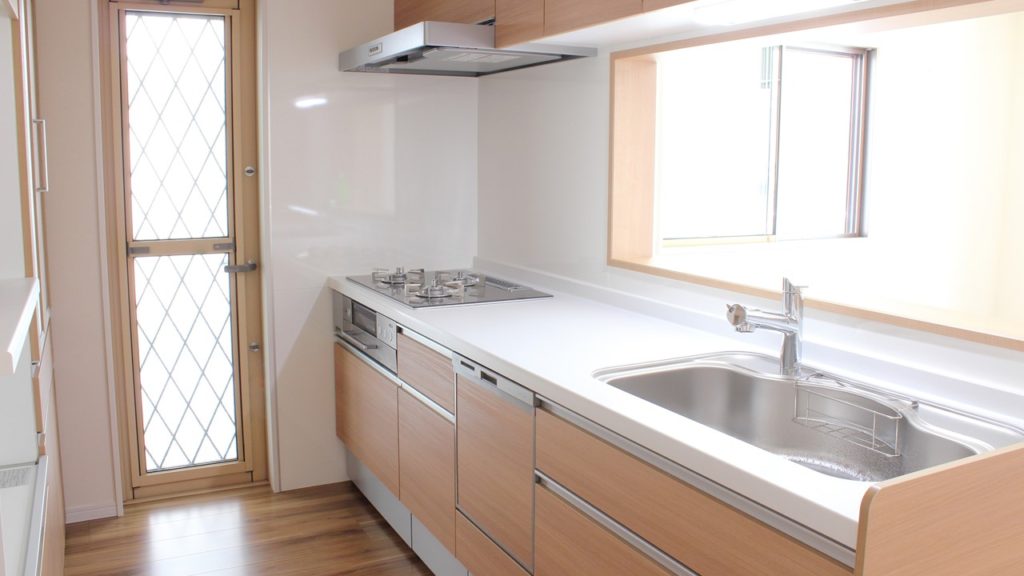 [作業範囲] キッチン換気扇、ガスコンロ、魚焼きグリル、シンク、水栓金具、手元照明カバー、壁タイル面、吊戸棚扉面、収納庫扉面、床